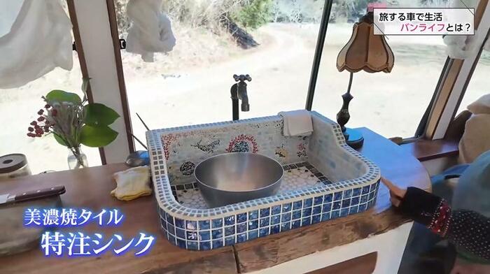 岐阜県のシンク屋さんにお願いをして、後ろの面を特別に自分で作らせてもらった。この旅を表していて、色んなところを旅しているバスがいる。