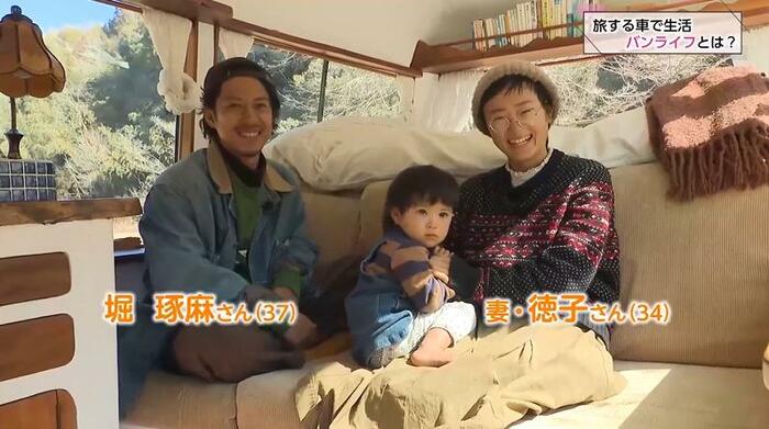 堀琢麻さんと徳子さん、娘の和(にこ)ちゃんが暮らしているのは、中古のマイクロバスを購入して夫妻2人でDIYしたキャンピングカーだ。