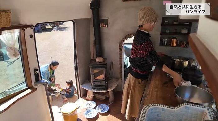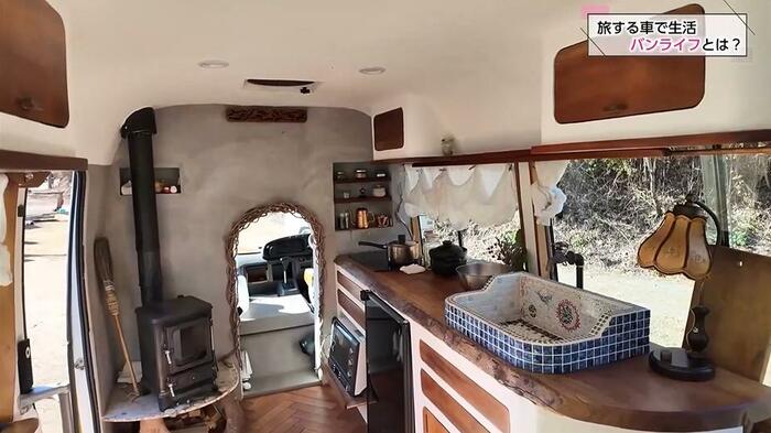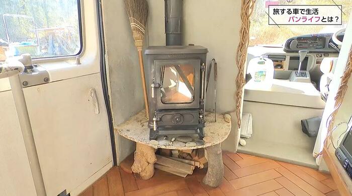 そして冬場の雪国でも快適に過ごせるよう車には薪ストーブも。プロの知恵を借りながら自分たちで設置したそうだ。
