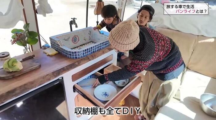 料理好きの徳子さんがこだわったキッチンは、車内でも不自由なく自炊ができるよう埋め込み式のIH調理器やオーブン、冷蔵庫を完備。電力は車の屋根に積んだ太陽光で全て賄っている。