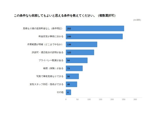 「この条件なら依頼してもよい」と思えるものを尋ねたところ、「見積もり後の追加料金なし(条件明記)」が252回答(84.0%)、「料金目安が事前に分かる」が246回答(82.0%)とほぼ同率でトップ2を占めました。依頼を阻む最大の壁を取り除く条件が明確に示されており、この2点を整備するだけで未利用層の依頼意向を大きく引き上げられる可能性があります。