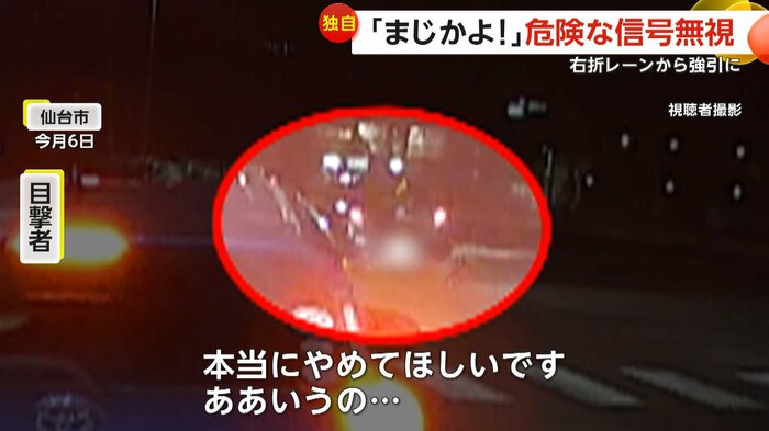 目撃者は「右曲がっていくんだなと思ったら、まさかの右から信号無視で、なおかつ右折レーンから直進という暴挙に出たので。本当やめてほしいです。ああいうの…」と話した。