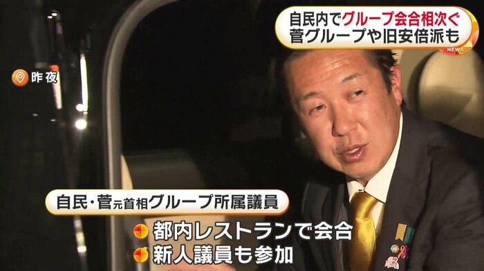 自民党の菅元首相のグループに所属していた議員らは26日夜、都内のレストランで会合を開き、新人議員も参加した。