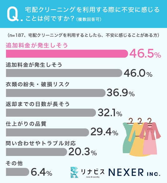 そのほかは「衣類の紛失・破損リスク」が36.9%、「返却までの日数が長そう」が32.1%、「仕上がりの品質」が29.4%、「問い合わせやトラブル対応」が20.3%という結果でした。