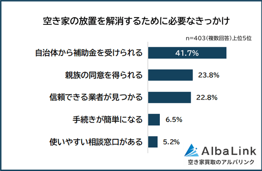 「どのようなきっかけがあれば、空き家の放置を解消できるか?」と聞いたところ、最も多かった回答は「自治体から補助金を受けられる(41.7%)」でした。2位「親族の同意を得られる(23.8%)」、3位「信頼できる業者が見つかる(22.8%)」が20%以上で続きます。