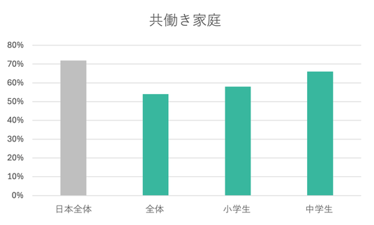 共働き家庭の割合は低い共働き家庭の割合は、54%でした。これは、日本全体の共働き家庭の割合約7割を下回ります(詳細4)。