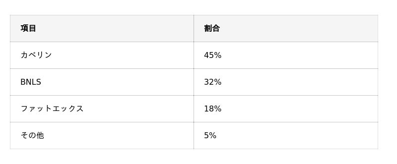 最も多かったのは「カベリン」(45%)で、次いで「BNLS」(32%)、「ファットエックス」(18%)という結果でした。複数の薬剤に回答が分かれる結果となりました。