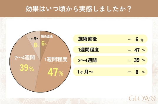 - 効果の実感時期は「1週間程度」が47%で最多(2~4週間39%、施術直後6%)