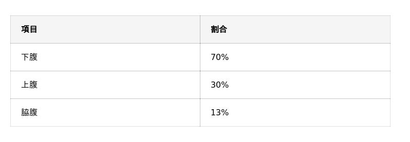 - 施術範囲は「下腹」が70%で最多(上腹30%、脇腹13%)