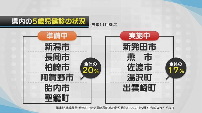 25年11月の時点での県内での5歳児健診の状況をみると、全30市町村のうち、新潟市や長岡市など6つの自治体が準備段階に、新発田市や佐渡市など5つの自治体ですでに実施をしている。