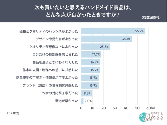 「次も買いたいと思えるハンドメイド商品は、どんな点が良かったときか」を尋ねたところ