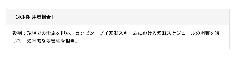 水田の水位を目安に、数日おきに入水と自然乾燥を繰り返すという手法。間断灌漑(AWD)の場合、連続的な入水に比べ、水使用量を削減することができ、水資源の保全にも寄与。