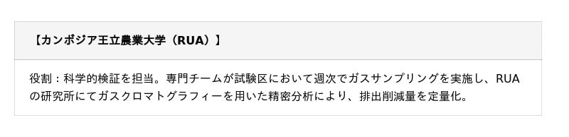 本プロジェクトで得たデータを、カンボジア国内の変革および持続可能な運営へとつなげるため、Green Carbonは、研究機関、現地パートナーと連携し統合型パートナーシップモデルを構築しました。Green Carbonは、プロジェクト全体のマネジメント、農家向け研修、カーボンクレジット創出を主導し、以下の機関とパートナーシップを締結しプロジェクトを推進しました。