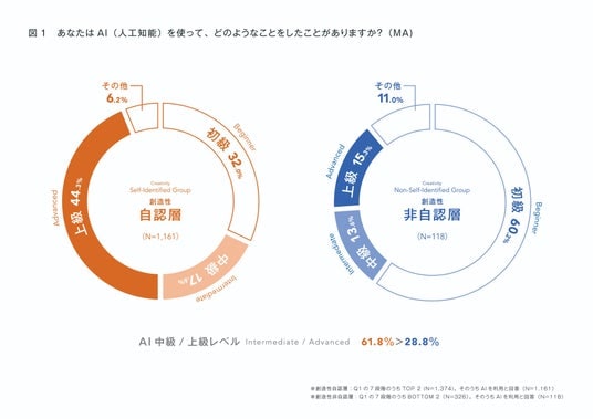 ・自分自身を創造的だと捉えている「創造性自認層」のうちAIを活用している61.8%が中級・上級レベル(コンテンツ制作やAIエージェント作成など)でAI活用。