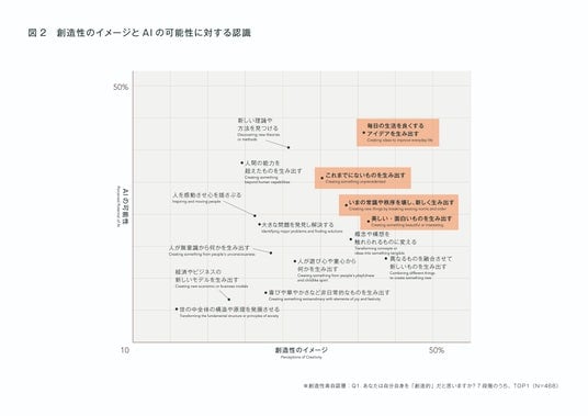 また、創造性自認が極めて高い「創造性高自認層」に対し、「創造性に対するイメージ」と「AIの可能性」を聴取したところ、「これまでにないものを生み出すこと(新しさの創造)」にとどまらず、「美しい・面白いものを生み出すこと(感性領域の創造)」、「毎日の生活を良くするアイデアを生むこと(日常での創造)」、さらには「常識や秩序を壊し新しく生み出すこと(創造的な破壊)」についても、創造性のイメージとAIの可能性の両方で高いスコアが見られた。