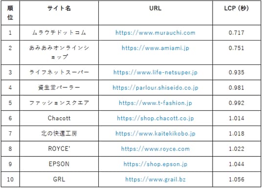 アマゾン、ヨドバシ.com、ビックカメラなどメガECサイトが上位100位以内(LCP 1.5秒未満)にランクイン