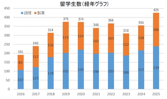 辻調理師専門学校、辻調理師専門学校東京(本部:大阪市、代表:辻芳樹、以下辻調グループ)では、2025年4月に244名の新入留学生を迎え、在校生と合わせて過去最高の425名の留学生が在籍しています。大阪の「辻調理師専門学校」では320名、東京の「辻調理師専門学校東京」では105名の留学生が調理・製菓を学んでいます。また日本料理・西洋料理・中国料理など“調理”を学ぶ学生は辻調グループ全体で239名、洋菓子・製パン・和菓子など“製菓”を学ぶ学生は186名で、国別では、韓国219名、中国91名、台湾59名と上位3ヶ国は毎年変わらず、全13ヶ国から学びに来ています。コロナ禍を除いて、留学生が増加する要因のひとつに日本での就労機会が増えたことも影響していると考えています。本校では、2026年2月19日時点で日本での就職内定を獲得した留学生は106名で、年々増加しています。