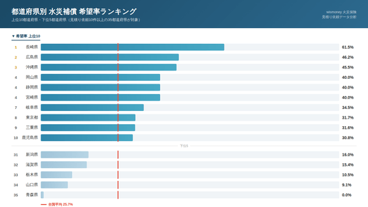 水災補償の希望率は長崎県が61.5%で突出して高く、広島県(46.2%)、沖縄県(45.5%)が続きました。全国平均は25.7%で、都道府県間の差が最大61.5ポイントと大きくなっています。