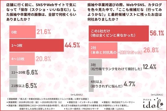 そこで今回、振袖レンタル『アイドルbyやまと』(https://idolbyyamato.jp/)を運営する株式会社アニバーサリーは、2023~2026年の過去4年間で、成人式での振袖または卒業式での着物を含む卒業袴をレンタルで着用し、前撮りをした女性を対象に、「成人式・卒業式衣装レンタルの利用実態とトレンド変遷」に関する調査を実施しました。