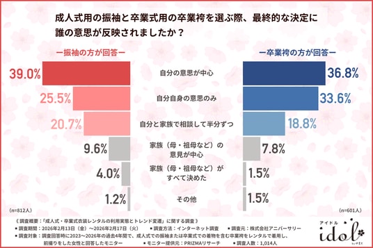 振袖、卒業袴ともに「自分の意思が中心」または「自分自身の意思のみ」と回答した方が多く、本人の希望が最も尊重されていることがわかります。