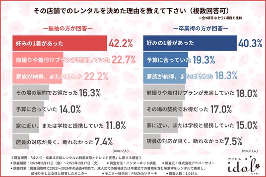 振袖、卒業袴ともに『好みの1着があった』ことが、その店舗でのレンタルを決めた要因となっており、衣装自体のデザインや納得感が契約において重要であることがわかります。