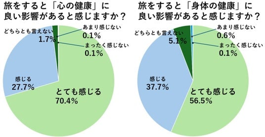 旅をすると「心の健康」に良い影響があると感じるか聞いたところ、98.1%が肯定。「歩き旅」をする理由としては、「リフレッシュ・ストレス解消」が最も多い回答でした。「身体の健康」に良い影響があるかについても同様に伺うと、良い影響を感じているという回答が94.2%でした。(n=1060)