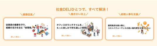 昨今、オフィスにおける「食」の福利厚生は、単なる食事の提供にとどまらず、「従業員の健康経営」「出社回帰に伴うコミュニケーション活性化(働きがい)」「人事総務担当者の運用負担軽減」など、企業ごとに多様な目的で導入・検討されるようになりました。「社食DELI」は、これまで累計800社以上の企業様に導入いただき、累計販売食数は1億食を突破しております。この度、より多くの企業様へ自社の課題に合った解決策をスムーズに見つけていただけるよう、「社食DELIひとつで、すべて解決!」をコンセプトにトップページのデザインを刷新し、新たに3つの課題別特設ページを開設いたしました。