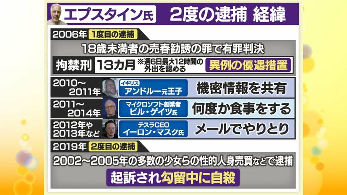 しかし、2005年、複数の未成年の少女らがエプスタイン氏のフロリダの自宅で、性的なマッサージなどをさせられたと告発し、事件が発覚。エプスタイン氏は、2008年、少女らへの性的人身売買などの罪で有罪判決を受けました。