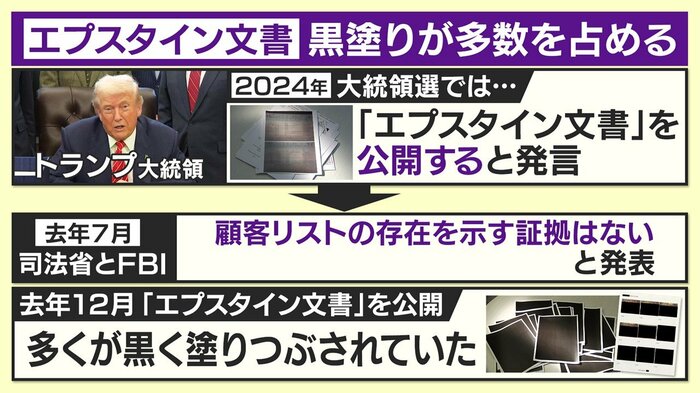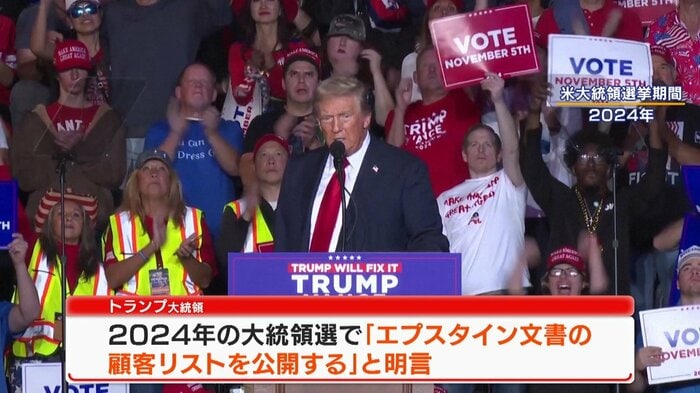 2024年の大統領選では自ら「エプスタイン文書の顧客リストを公開する」と明言していたトランプ氏。2025年11月には文書の公開法案に署名し、その後、段階的な文書の公開が始まりました。