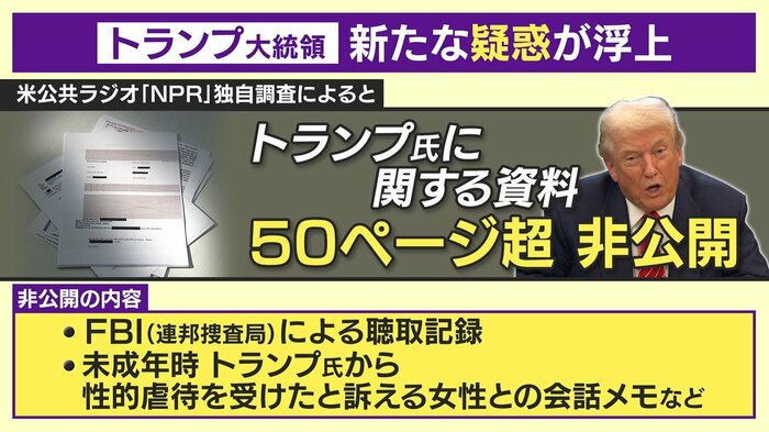 しかし、一部メディアは、公開されていないエプスタイン事件に関する資料の中には、未成年の時にトランプ氏から性的虐待を受けたと主張する女性との会話のメモなどが含まれると報じています。