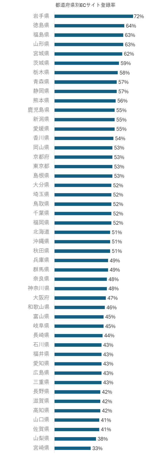 東北・四国・九州エリアでは登録率が50%を超える県も多く、岩手県や徳島県では60%を超える水準となっています。都市圏においても利用は着実に進んでおり、地域規模にかかわらずECを活用した購買体制の整備が進展していることがうかがえます。
