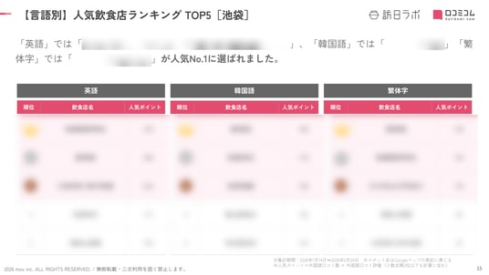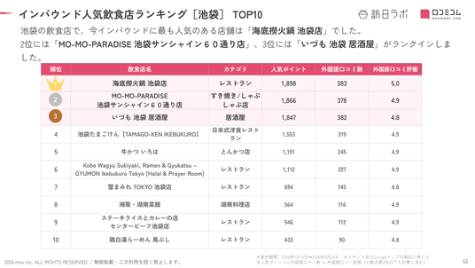業界最大級のインバウンドビジネスメディア「訪日ラボ」及び 店舗向け集客一元化プラットフォーム「口コミコム」を運営する株式会社mov(代表取締役:渡邊 誠、本社:東京都渋谷区、以下mov)は、池袋の飲食店に寄せられた最新の口コミデータから、独自の『インバウンド人気飲食店ランキング』を発表しました。
