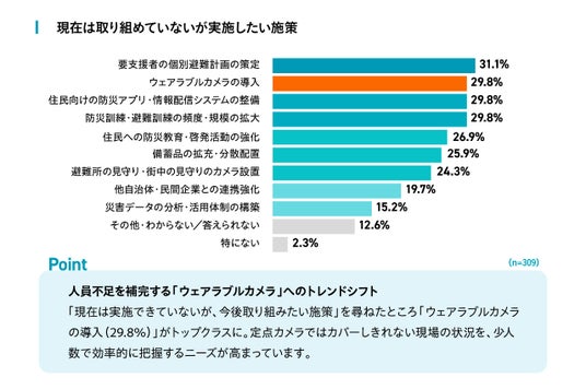 「現在は実施できていないが、今後取り組みたい施策」を尋ねたところ、「ウェアラブルカメラの導入(29.8%)」が防災アプリや訓練と並び上位に挙がりました。