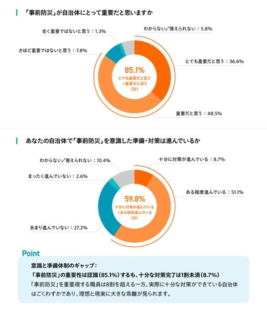 ■ 理想と現実のギャップ:防災庁が掲げる「事前防災」について85.1%が重要視していると回答するも、“十分に対策済み”は8.7%にとどまる本調査では、自治体職員の85.1%が「事前防災」を重要視していることが分かりました。しかし、その進捗について「十分に対策ができている」との回答はわずか8.7%に留まり、意識の高さと実行フェーズの間に大きなギャップがあることが浮き彫りとなりました。