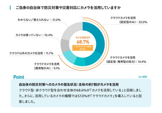 さらに、活用しているカメラの種類では、自治体全体の半数以上となる57.0%が「クラウドカメラ」を導入していると回答しました。
