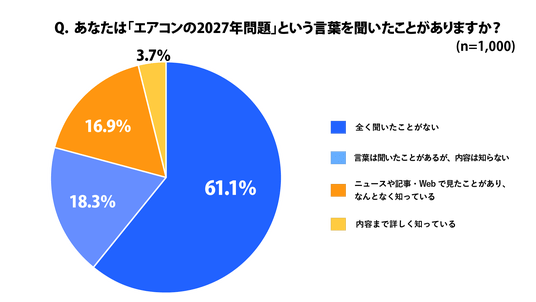 「あなたは「エアコンの2027年問題」という言葉を聞いたことがありますか?」という問いに対して「内容は知らない」「全く聞いたことがない」という方は約8割に及びました。