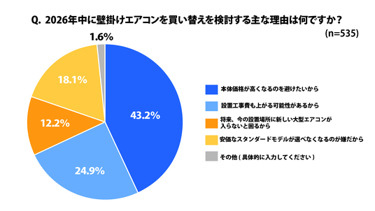 買い替え意向のある「強くそう思う」「ややそう思う」という方の中で、買い替えを検討する理由としては、「本体価格が高くなるのを避けたい」が多数、次いで「設置工事費用も上がる可能性があるから」という、買い替え需要の増加による、設置工事費用の値上がりの懸念も考えられます。