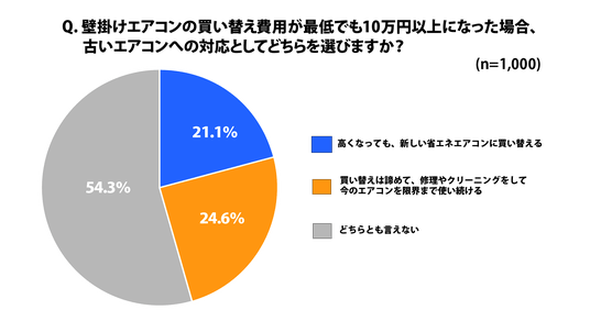 2027年以降、エアコンの買い替え費用が10万円以上になった場合、買い替えではなく、メンテナンスとして修理やクリーニングでの対応をしたい方は約4人に1人となり、「どちらとも言えない」検討中の方が半数となりました。
