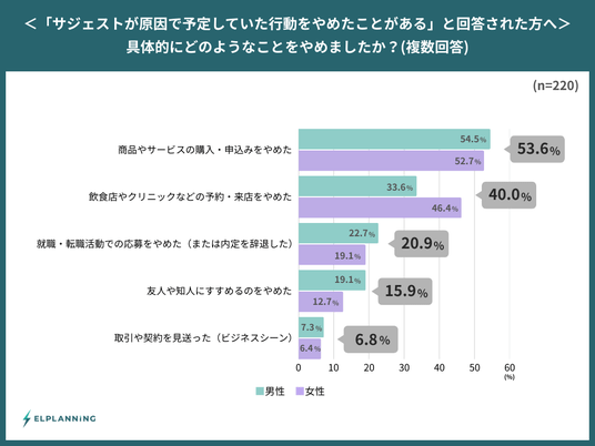 ・ネガティブなサジェストが原因で、44.0%のユーザーが行動を中断。影響を受けた層の53.6%が「購入」を、40.0%が「来店予約」を見送ったことがあると回答。