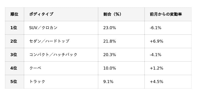 輸入車ボディタイプ別買取ランキングは、1位のSUV/クロカン以下は、前月と変わり、前月2位のコンパクト/ハッチバックと3位のセダン/ハードトップが順位を入れ替え3位と2位。5位のクーペと6位だったトラックがひとつずつ順位をアップして4位と5位になっています。