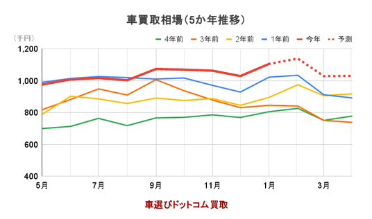 この相場は2月に115万円近くにまで上昇し、新生活需要が落ち着く3月以降に若干下落する予想です。しかしながら、車選びドットコムのデータでは、平均買取価格が100万円を下回ることなく推移し、夏頃に再び上昇すると推測されています。
