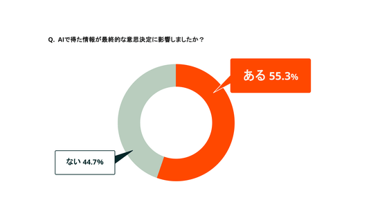 生成AIを活用した買い手のうち、「生成AIで得た情報がきっかけで、当初検討していなかった製品を候補に加えた」人は52.4%、「生成AIで得た情報が最終的な意思決定に影響した」人は55.3%に達しました。いずれも半数を超えており、商談開始から意思決定に至るまで、買い手への生成AIの影響力が高まっていることがわかります。