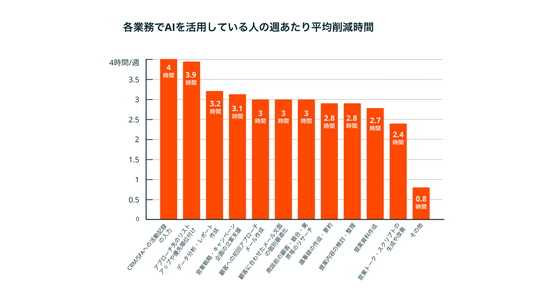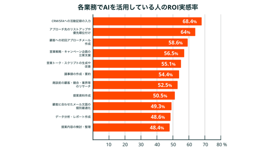 生成AI活用の効果を、各業務で「生成AIを活用している」と回答した人の週あたりの平均削減時間で見ると、「CRM/SFAへの活動記録の入力」(4.0時間)と「アプローチ先のリストアップや優先順位付け」(3.9時間)が特に高い結果となりました。有料生成AIツールに対するROI実感率も「CRM入力」と回答した人は68.4%、「アプローチ先のリストアップ」と回答した人は64%と高く、定型作業で繰り返しの多い業務が生成AI活用の効果を感じやすい「入口」になり得ることがわかりました。