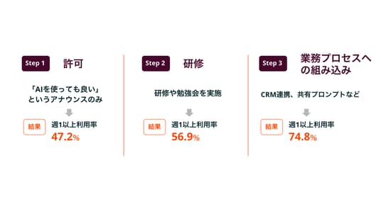 さらに、この「支援あり」を支援内容の段階で3つに分類して生成AI活用頻度(週1回以上)を見ると、Step 1「許可」(生成AIを使っても良いというアナウンスのみ)では47.2%、Step 2「研修」(研修や勉強会の実施)では56.9%、Step 3「業務プロセスへの組み込み」(CRM連携、共有プロンプト等)では74.8%まで上昇します。単なる許可や研修だけではなく、日常業務や営業プロセスに生成AIを統合する「仕組み化」が、生成AI活用定着につながると言えます。