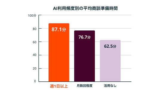生成AIの活用によって創出した時間の使い道は「提案の質を高めるための思考時間」(43.9%)が最多で、「休憩やリフレッシュ、労働時間の短縮」(38.2%)、「業務の振り返りや改善の検討」(34%)、「顧客との対話・関係構築」(32.3%)が続きました。生成AI利用頻度別の平均商談準備時間は、週1日以上利用する人が約87分、月数回程度の人が約77分、活用なしの人が約63分であり、因果関係は言い切れないもののAI利用頻度が高い人ほど商談準備により多くの時間をかけている傾向が見られます。「提案の質を高める思考」や「顧客との対話」は、買い手が営業に求める「生成AIにはない価値」と合致しており、創出時間が買い手のニーズに応える方向に再投資されている可能性があります。