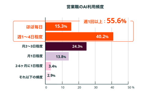 営業担当者および営業責任者の生成AI活用率は1年で28.9%から43.4%へと14.5ポイント増加しました。さらに、生成AI活用経験のある人の半数以上(55.6%)が「週1回以上」利用しており(ほぼ毎日15.3%、週1~4日40.2%)、日常業務への定着が進んでいます。