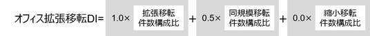 オフィス拡張移転DIは、オフィス移転後の賃貸面積が移転前と比較して(1)拡張、(2)同規模、(3)縮小、した件数を集計し、次式により計算している。