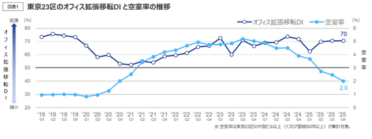 オフィス拡張移転DIは0%から100%の間で変動し、基準となる50%を上回ると企業の拡張意欲が強いことを表し、50%を下回ると縮小意欲が強いことを示す。2025年第3・第4四半期における東京23区のオフィス拡張移転DIは70%となった。2期連続で70%となり、高い水準を維持している。