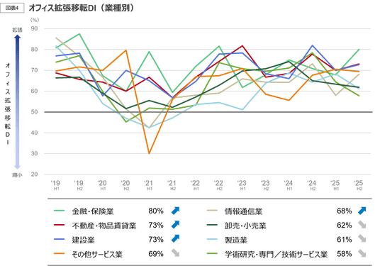 一方で、その他サービス業や卸売業・小売業、製造業、学術研究・専門/技術サービス業は前期から低下した。ただし、いずれの業種もオフィス拡張移転DIは50%を超えており、テナントの拡張意欲は底堅い傾向にある。