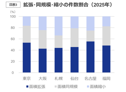 2025年における拡張・縮小移転の件数割合は、いずれの都市も拡張移転が4割以上を占めている。縮小移転も一定程度あるものの、新築・築浅ビルへの移転に際して、面積を縮小させながら、総コストを抑える前向きな移転が散見される。テナントの移転に向けた動きは、全般的に活発な状況が続いている。